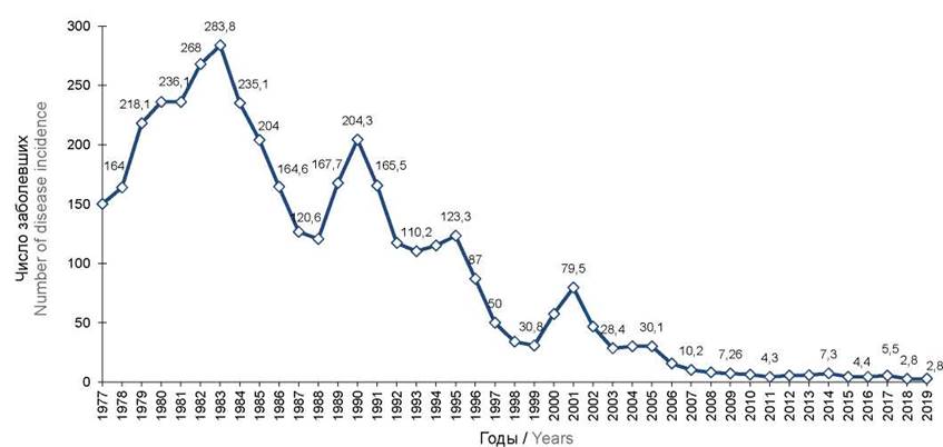 The incidence of hepatitis A in the Russian Federation in 1977–2019 (per 100 thousand population).Несмотря на снижение заболеваемости, эпидемиология ГА сохраняет свои основные характеристики: