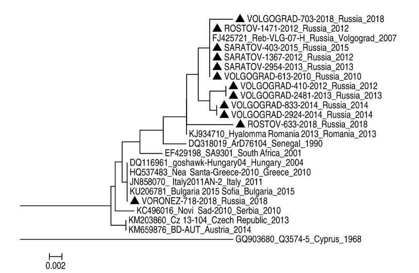 Fig. 3. The phylogenetic tree based on 5'-UTR-protC locus of WNV lineage 4 built by the Neighbor-joining method. The triangles mark isolates sequenced in this study.
