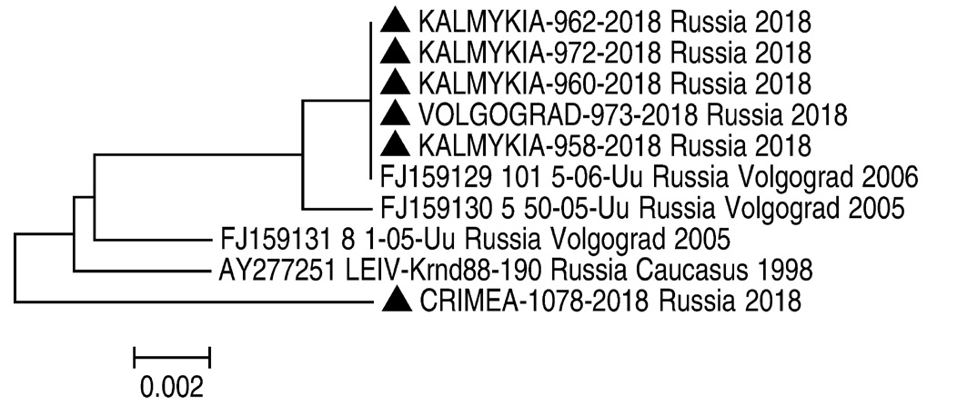 При секвенировании РНК-изолятов ВЗН генотипа 4 из Волгоградской области и Республики Калмыкия была выявлена их идентичность волгоградскому изоляту (100% гомология), выделенному в 2006 г. (101_5-06-Uu, GenBank: FJ159129). А изолят ВЗН из Крыма существенно отличался по числу и локализации нуклеотидных замен от остальных, выделенных на территории России в разные годы, и формировал обособленную ветвь на дендрограмме (рис. 3). Гомология последовательности изолята ВЗН из Крыма (CRIMEA-1078-2018) с последовательностями прототипного штамма (LEIVKrd88-190) и изолята из Волгограда (101_5-06-Uu) составляла 98,56 и 98,19% соответственно.