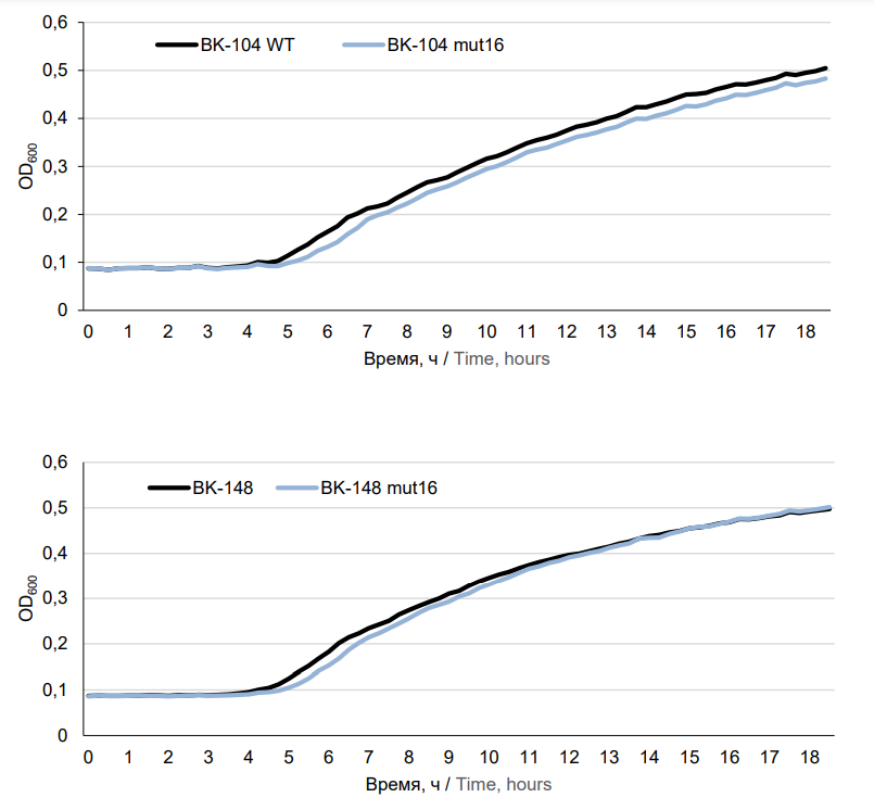 Рассчитывали продолжительность лаг-периода S-образной кривой (Tlag), время удвоения количества микробных клеток в экспоненциальной фазе роста (Tdoubling), площадь под S-образной кривой бактериального роста (AUC). Аппроксимацию зависимости концентрации микробных клеток от OD600 и расчёт AUC выполняли в программе «GraphPad Prism 8.3» («GraphPad Com»). Параметры Tlag и Tdoubling определяли с помощью программы «GrowthRates 4.3» (Bellingham Research Institute) в полулогарифмических координатах (lnКОЕ/мл). Качество аппроксимаций оценивали на основе значений квадрата коэффициента детерминации (R2), которое во всех случаях составляло ≥ 0,99. Для оценки значимости различий параметров бактериального роста штаммов K. pneumoniae WT и mut16 с использованием программы «GraphPad Prism 8.3» рассчитывали ранговый Т-критерий Вилкоксона и соответствующий ему уровень значимости p.