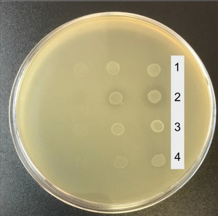 Для оценки антагонистической активности использовали представителей семейства Enterobacteriaceae — изоляты Enterobacter cloacae 3_222_2 и Klebsiella pneumonia 3_219_1, выделенные из кала пациентов с БК, а также культуру Salmonella enterica, предоставленную сотрудниками Республиканской клинической инфекционной больницы им. проф. А.Ф. Агафонова (Казань, Россия). Антагонистическую активность оценивали на плотной питательной среде согласно [24] с некоторыми модификациями. Для этого тестовую культуру бактерий смешивали с расплавленным 0,8% LB-агаром, наносили на 2% LB-агар и инкубировали в течение 30 мин при комнатной температуре до полного затвердения. По 3 мкл исходной культуры каждого штамма E. coli (OD600 = 1,0) и её разведений в 10 и 100 раз наносили на подготовленные чашки с тестовой культурой и инкубировали в течение ночи при 37°C. Эксперимент проводили в 2 повторах. Активность считали антагонистической при размере зон задержки роста тестовой культуры более 1 мм (рис. 1).