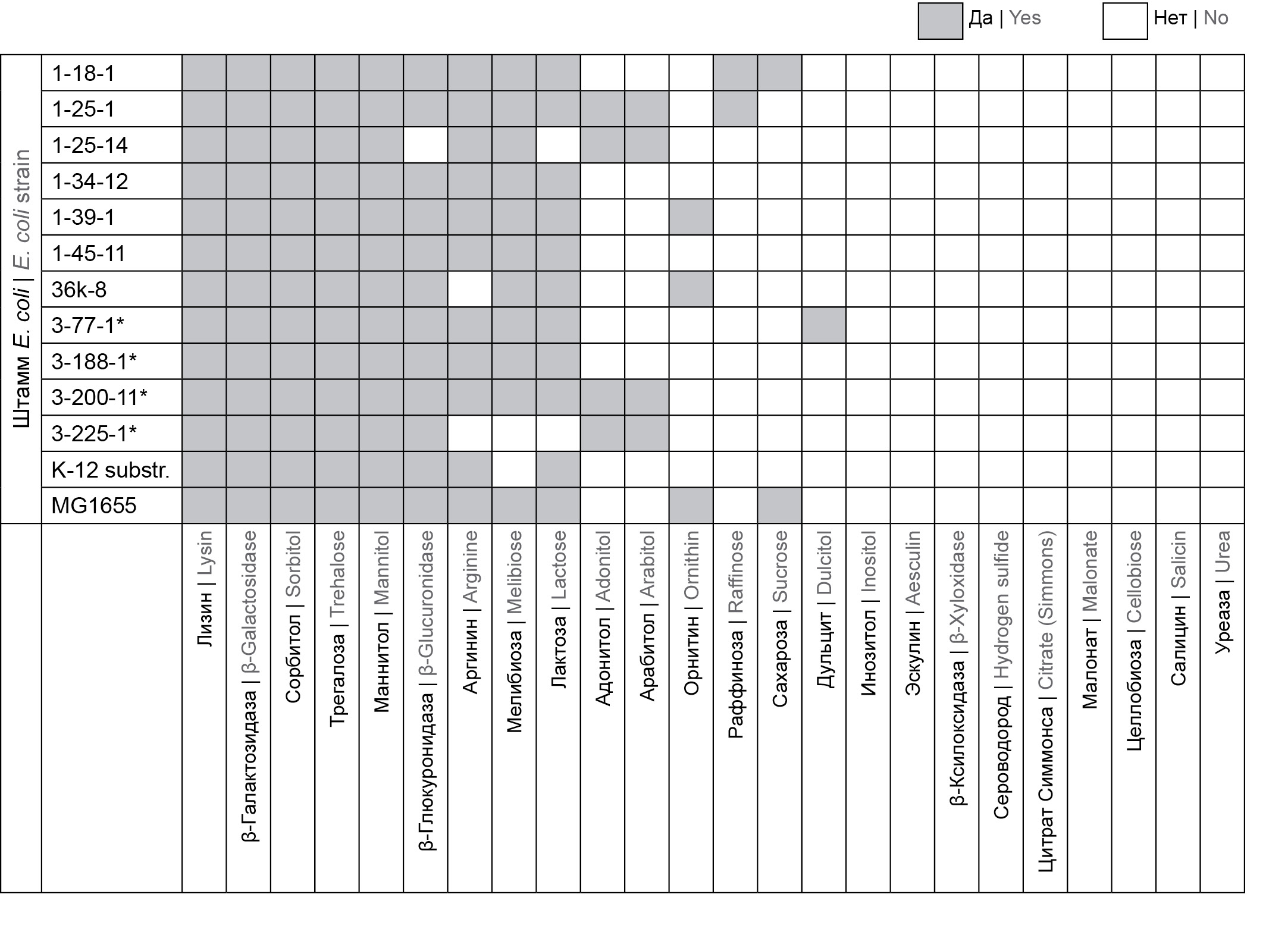 Рис. 2. Биохимические свойства клинических штаммов E. coli, проявивших антагонистическую активность в отношении представителей семейства Enterobacteriaceae.*Штаммы от пациентов с БК. E. coli K-12 substr. MG1655 — контрольный штамм. / Fig. 2. Biochemical properties of clinical E. coli strains showing antagonistic activity against Enterobacteriaceae. *Strains from patients with Crohn’s disease. E. coli K-12 substr. MG1655 is a control strain.