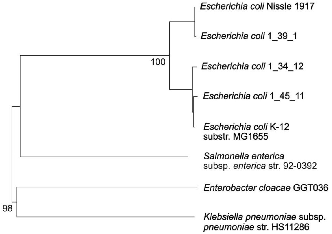 Проведён филогенетический анализ штаммов, подавляющих рост нескольких протестированных представителей семейства Enterobacteriaceae. Оказалось, что штаммы 1_34_12 и 1_45_11 филогенетически близки лабораторному штамму K-12 substr. MG1655, а штамм 1_39_1 родственен известному пробиотическому штамму Nissle 1917 (рис. 3).