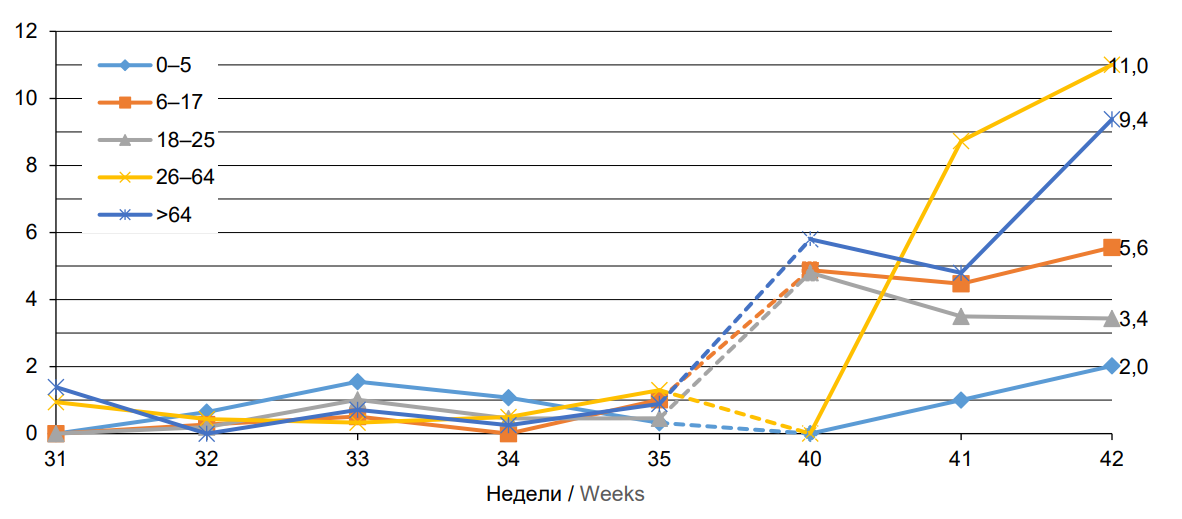 Table 2. Prevalence of SARS-CoV-2, ARVI, and influenza pathogens in age groups