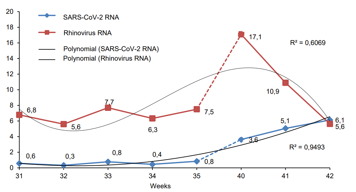 Results. 11.1% of the tested samples showed positive results; the rhinovirus prevailed (7.32%), while SARS-CoV-2 was detected in 1.66%. In autumn, the proportion of SARS-CoV-2 infected cases increased from 0.49% to 4.02% (p < 0.001). The SARS-CoV-2 RNA concentration was up to 1010 copies/mL.