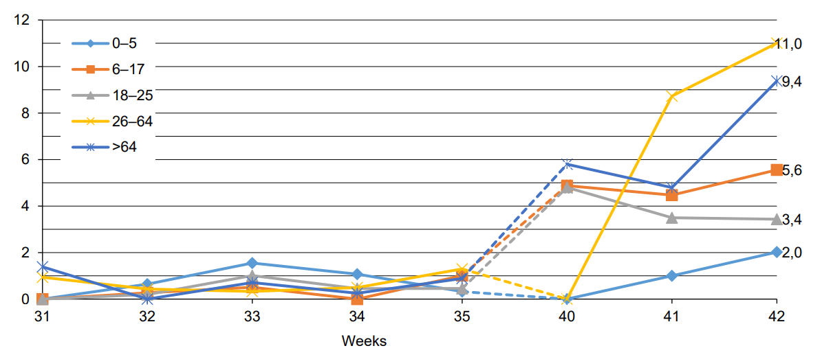 Fig. 1. Weekly dynamics of the number of the infected. The vertical axis shows the proportion of positive cases in the total number of participants, %