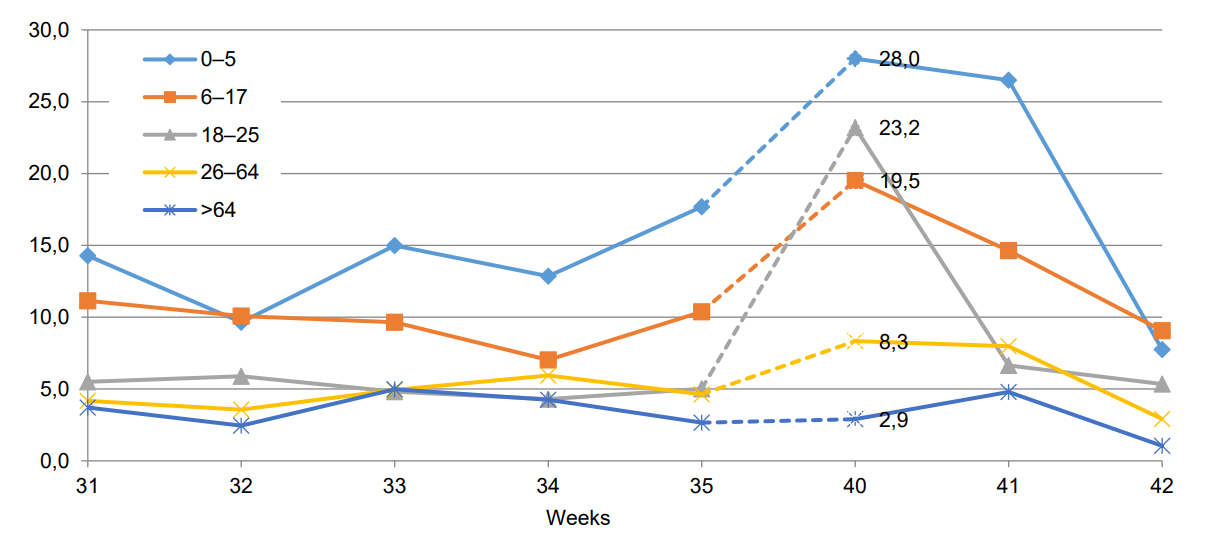 the Smorodintsev Research Institute of Influenza of the Ministry of Health of Russia regarding the frequency of diagnosis of rhinovirus infection and COVID-19 in people with ARVI symptoms2. Based on the data from the Smorodintsev Research Institute of Influenza, the proportion of positive cases of rhinovirus infection starts decreasing, while the SARS-CoV-2 detection rate starts increasing from the 39th week.