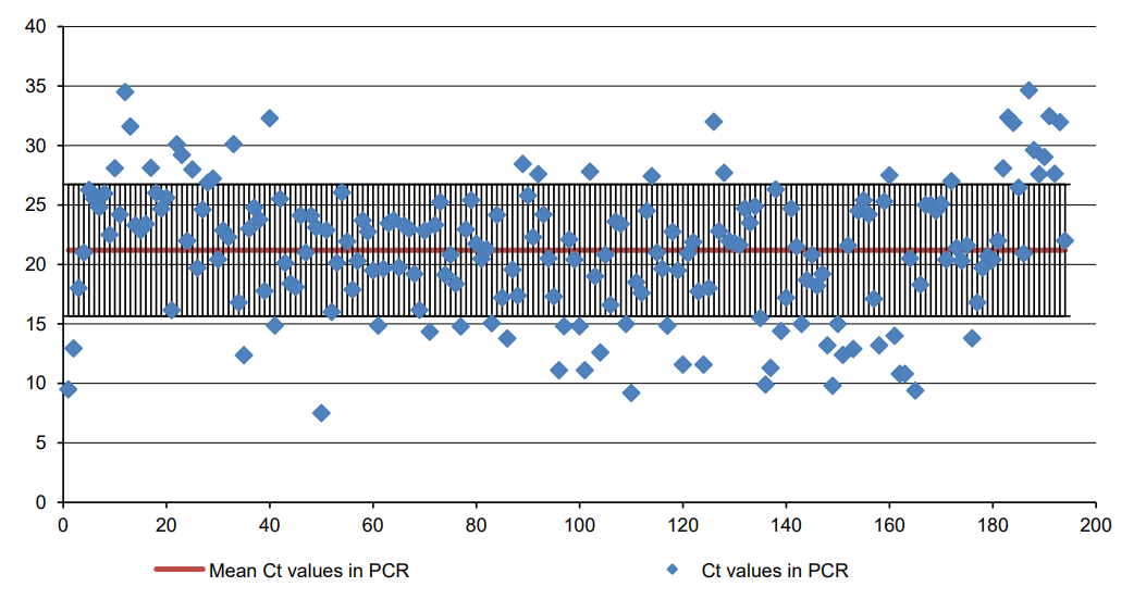 Parainfluenza virus RNA | 5 | 0,94 | 18 | 1,14 | 32 | 1,30 | 30 | 1,08 | 43 | 0,93 | 24 | 1,12 | 0,8 |