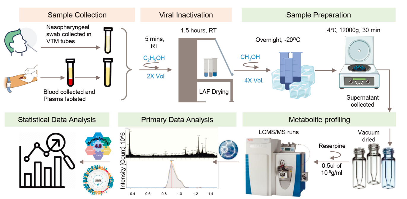 Materials and methods. Metabolome profiling of 106 plasma samples and 24 swab samples from symptomatic patients in the Indian population of the Mumbai region was done. COVID-19 positive samples were further segregated under the non-severe COVID-19 and severe COVID-19 patient cohort for both plasma and swab.