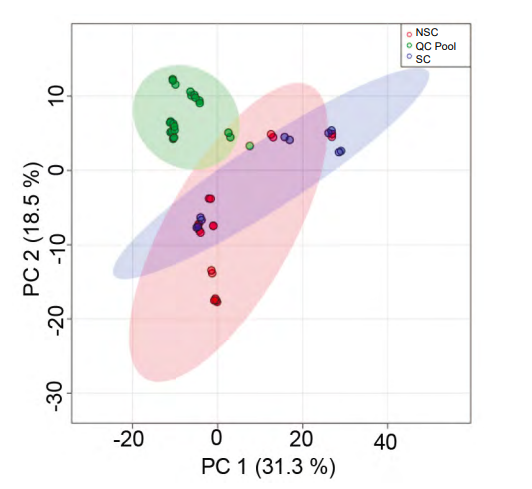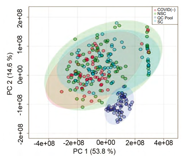 As advised by the clinicians, COVID-19(+) patients were categorized into non-severe (patients with mild fatigue, fever, cough, and breathlessness with non-invasive ventilation) — NSC and severe (patients with bilateral pneumonia and acute respiratory distress symptoms with mechanical ventilation support) — SC [33]. In total, 106 plasma samples and 24 swab samples were processed for metabolome profiling. The study cohort included plasma samples from 31 patients with COVID-19(–) patients, 43 NSC patients, and 29 samples from SC patients. Similarly, swab samples from COVID-19(–) patients (n = 5), NSC (n = 9) and SC (n = 5) were included in the study. The age, gender distribution, hematological parameters, and biochemical parameters of the patients enrolled in the study can be found in Table 1.
