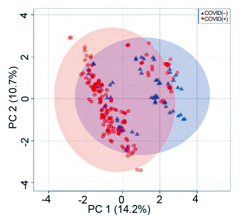 #No clinical data available for 2 patients from the COVID-19(–) group.
