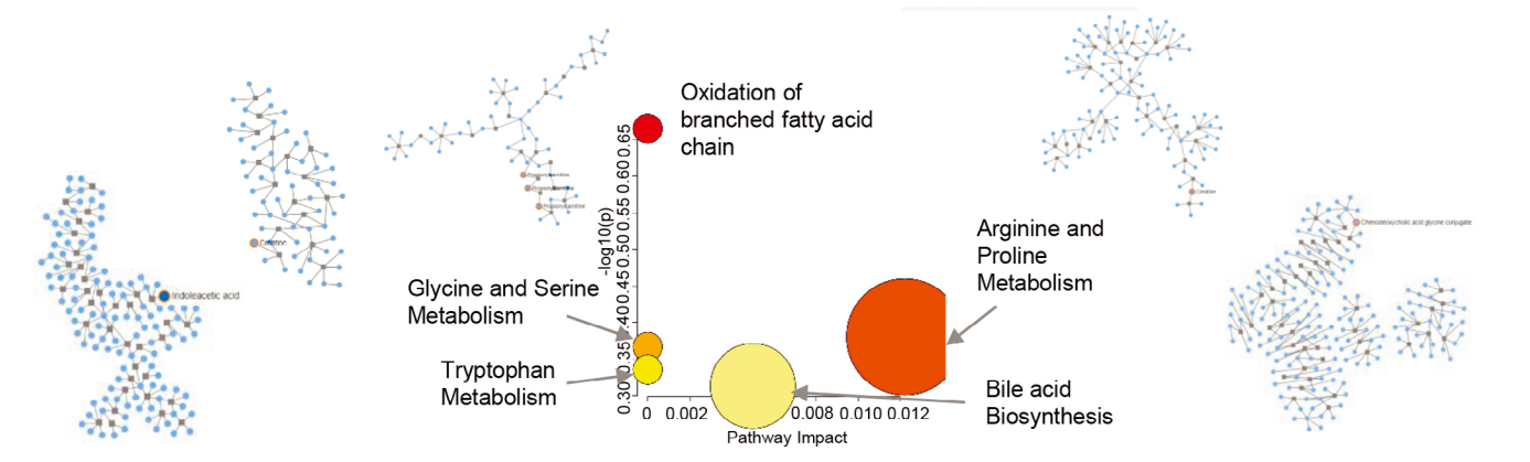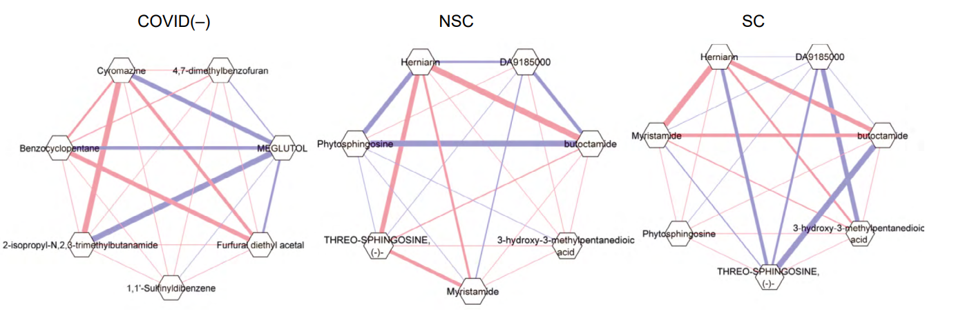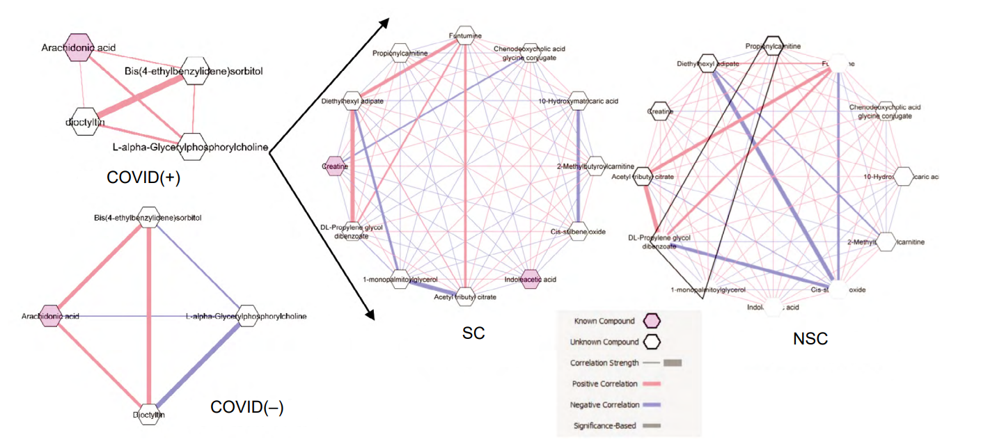 Therefore, in this study, along with a comprehensive metabolomics analysis of individual plasma and nasopharyngeal swab samples from COVID-19 patients with different severity of infection, we performed the blood exposome analysis. In the metabolomics study, we found the significantly altered and most frequently reported creatinine and indole-3-acetic acid in the COVID-19 severe sample cohort compared to COVID-19 non-severe sample cohort [31][32]. Also, propionylcarnitine, monoglycerides and cis-stilbene oxide in the same plasma samples comparison but not frequently reported. We also found threo-sphingosine, phytosphingosine, myristamide, herniarin, butoctamide and 3-hydroxy-3-methylpentanedioic acid altered in swab samples of severe COVID-19 as compared to non-severe COVID-19 sample cohorts. We further carried out pathway analysis for understanding the role of significantly altered metabolites on various human biological pathways by using published data and our experimental data. The most consistent and recurring metabolites may form the basis for the future development of new prognostics and therapeutic intervention in a precise manner. In addition, we also report 3 significant blood exposomes (2-benzothiazolylthio) acetic acid, tabun, contrastigmin, deoxymethyl-SA, which correlate with the metabolic pathways to differentiate the COVID-19 positive cohort COVID-19(+) from negative cohort COVID-19(–).