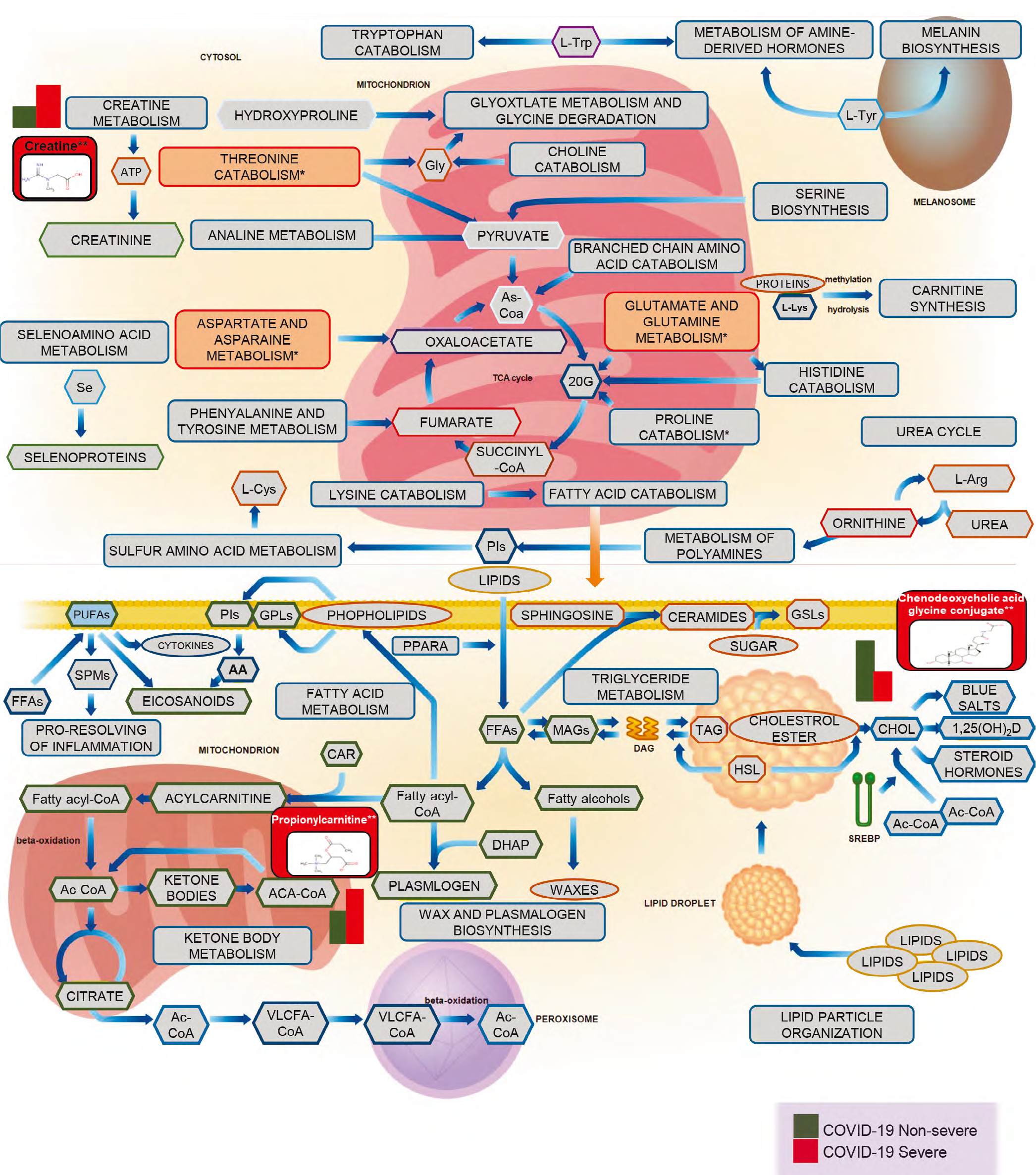 Results. After analyzing the raw files, total 7,949 and 12,871 metabolites in plasma and swab were found. 11 and 35 significantly altered metabolites were found in COVID-19 positive compared to COVID-19 negative plasma and swab samples, respectively. Also, 9 and 23 significantly altered metabolites were found in severe COVID-19 positive to non-severe COVID-19 positive plasma and swab samples, respectively. The majorly affected pathways in COVID-19 patients were found to be the amino acid metabolism pathway, sphingosine metabolism pathway, and bile salt metabolism pathway.