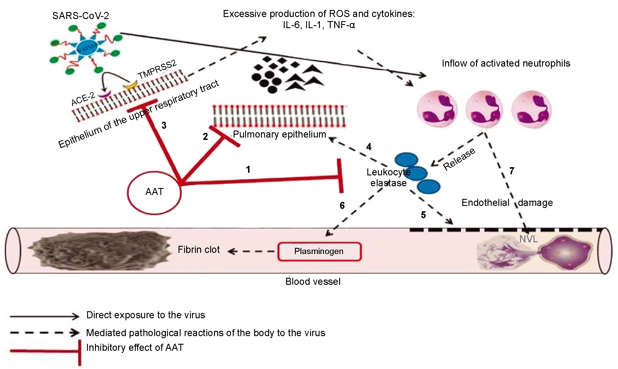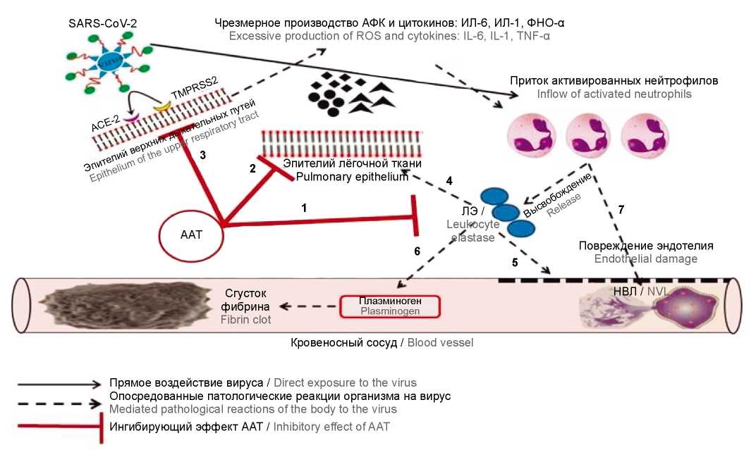 1 — neutralization of the extracellular proteolytic activity of leukocyte elastase, preventing damage to the pulmonary epithelium (4), vascular endothelium (5), destruction of plasminogen (6) and excessive formation of NVL (7);