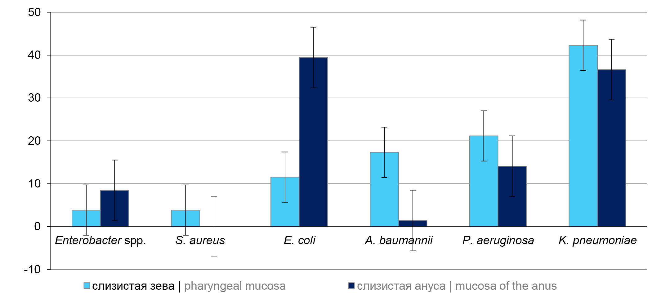 The results of the bacteriological studies of the children’s oral and anal mucosa show that the obtained isolates are represented by gram-positive and gram-negative bacteria as well as by the minor quantity of fungi of the genus Candida. The group of gram-positive bacteria (27.3% [95% CI, 21.7–33.4]) was comprised by bacteria of the genera Staphylococcus (S. aureus and other species), Streptococcus (primarily S. vestibularis, S. salivarius) and Enterococcus faecalis. Gram-negative isolates are represented by Enterobacterales bacteria (41.6% [95% CI, 35.3–48.1]) and nonfermenting gram-negative bacteria (22.7% [95% CI, 17.5–28.5]). Among representatives of Enterobacterales, we identified bacteria of the following genera: Escherichia, Klebsiella, Serratia, Enterobacter; the cluster of nonfermenting gram-negative bacteria was comprised by Acinetobacter spp., Pseudomonas spp., Stenotrophomonas maltophilia and Elizabethkingia meningoseptica. The isolates from the studied loci demonstrated the dominance of Enterobacterales bacteria. Fungi of the genus Candida accounted for 8.4% [95% CI, 5.2–12.7].