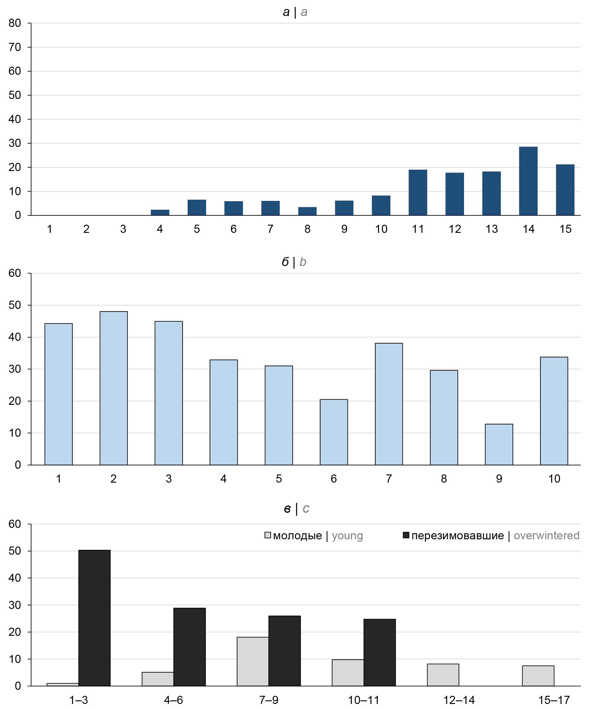 а — осень, блохи выплода и заражения текущего года; б — весна, перезимовавшие имаго весной следующего года; в — весна, результаты параллельно проведённых опытов с имаго, заражёнными непосредственно перед началом эксперимента и перезимовавшими, инфицированными осенью предыдущего года. По осям абсцисс – подкормки, по осям ординат – доля блох с конгломератами чумного микроба за подкормку, %.