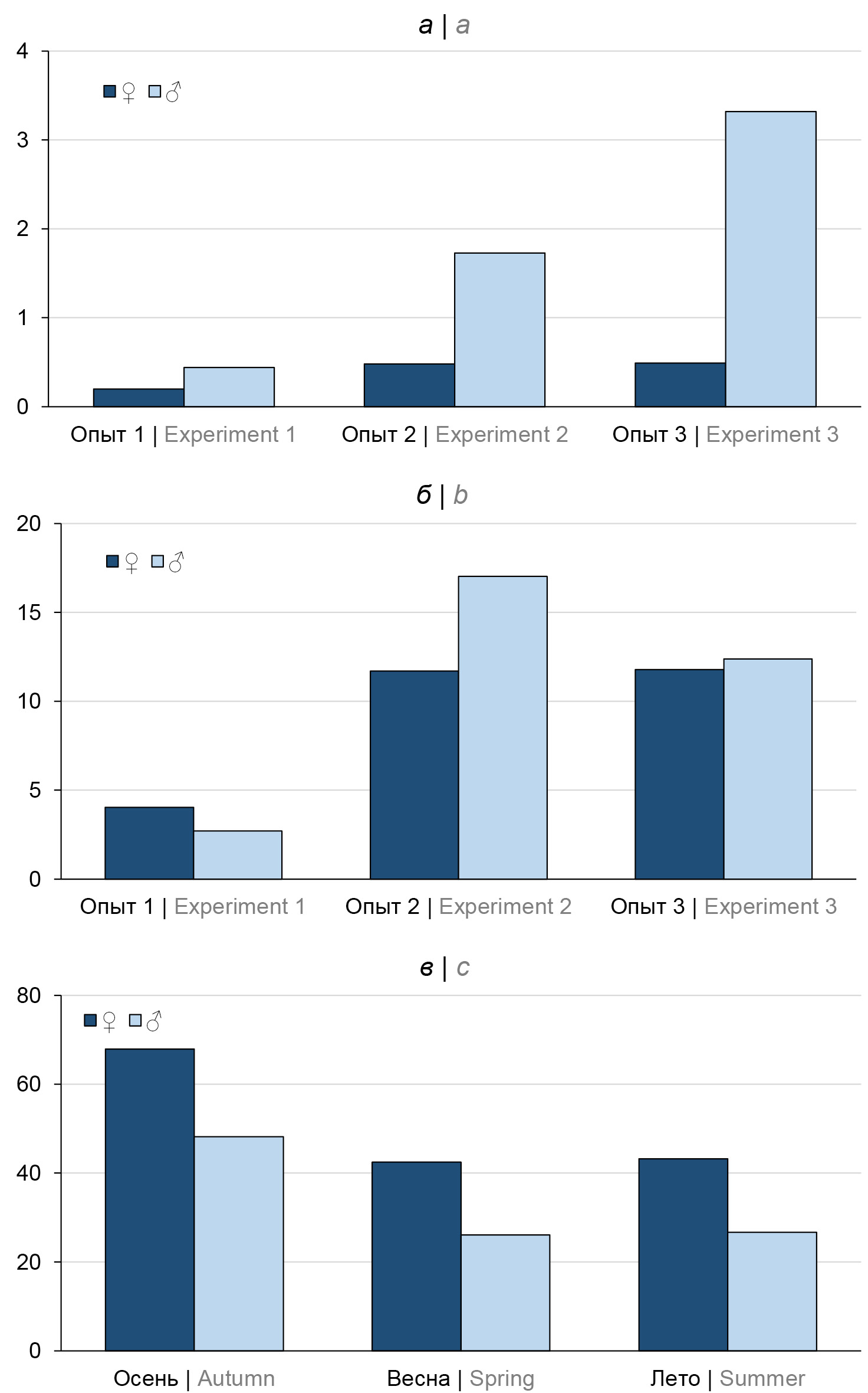 Предполагалось, что выраженный половой диморфизм у блох должен отражаться на способности к сохранению и распространению Y. pestis самками и самцами. По результатам 3 опытов, проведённых в июле–августе (в разные годы), доля «блокированных» самцов C. tesquorum в этот период значительно превышала долю самок с «блоком» (рис. 2, а). Половые различия по данному признаку достоверны для показателей всех анализируемых летних опытов (для первого и второго — р < 0,05, для третьего — р < 0,001). Процесс «блокообразования» у самцов начинался и заканчивался раньше, чем у самок. При этом закономерных половых различий в формировании бактериальных «глыбок» в летний период не обнаружено (рис. 2, б). Первых самок с «глыбками» Y. pestis регистрировали в те же сроки, что и самцов.