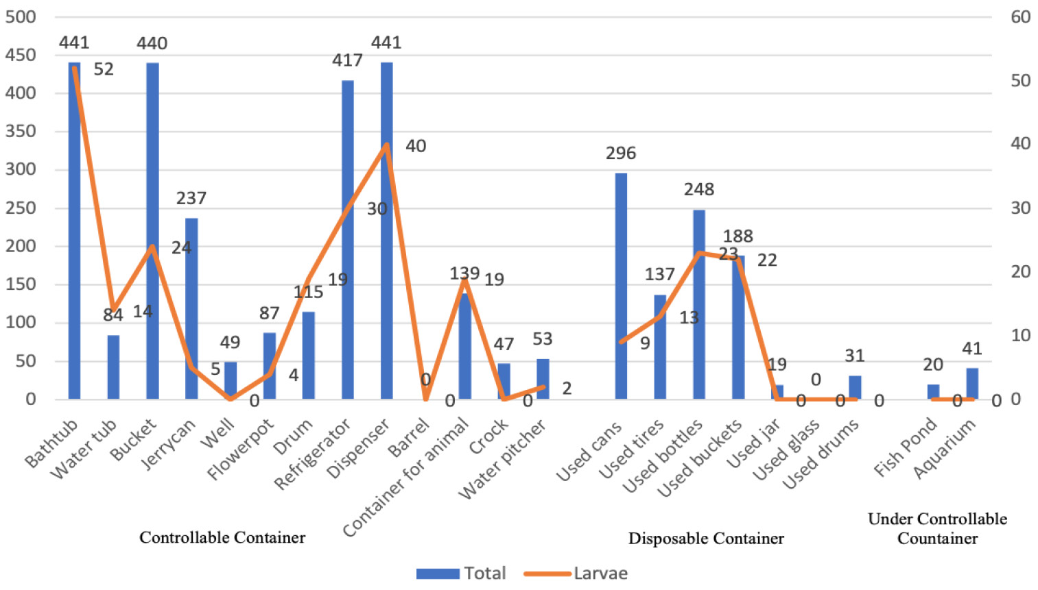 Containers were categorized into three groups based on their purpose: Controllable containers, disposable containers, and under-controllable containers. Water storage containers recorded in the survey as controlled containers are places that can be maintained or controlled, such as bathtubs, water tanks, buckets, jerry cans, wells, flowerpots, drums, refrigerators, dispensers, barrels, animal drinkers, crocks and gutters. Used containers are waste or places that are no longer used, such as used cans, tires, bottles, buckets, jars, glasses, and drums. Furthermore, containers such as fishponds and aquariums were deemed under-controllable.