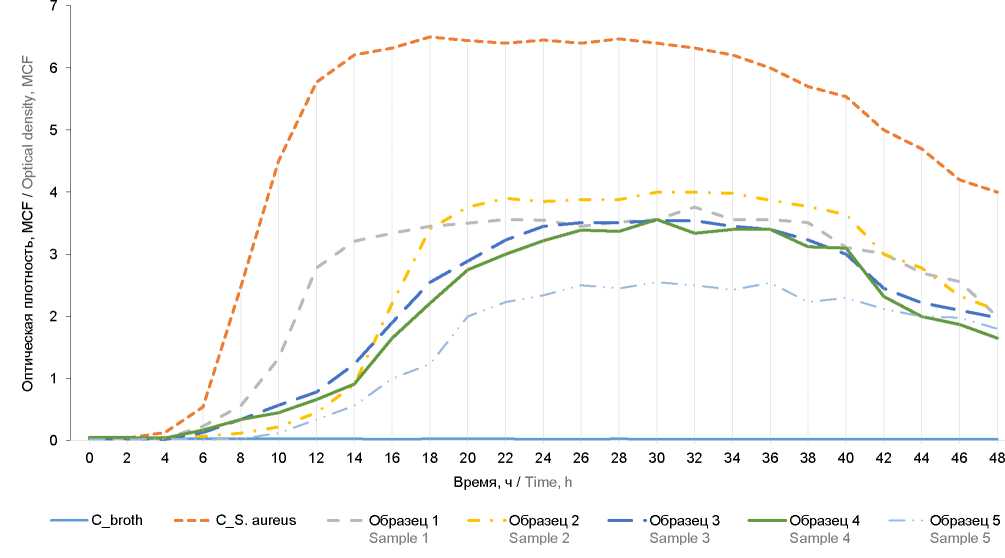 Логарифмический период отличался существенно сниженной скоростью бактериальной генерации (≈0,38 ± 0,3h+2 McF), что повлияло на более плавное увеличение биомассы, а следовательно, и показатель ОП исследуемого образца. Просматривающейся границы перехода лог-периода в период отрицательного ускорения не наблюдалось. Экспоненциальная фаза данного образца отличалась максимальной продолжительностью относительно предыдущих образцов с пиковым показателем ОП максимальной биомассы к 24-му часу эксперимента (3,48 ± 0,3 McF). Стационарная фаза отмечалась непродолжительностью, без признаков прироста биомассы. Средний показатель ОП в стационарном равновесии — 3,51 ± 0,3 McF. Фаза отмирания проходила аналогично контрольному образцу.