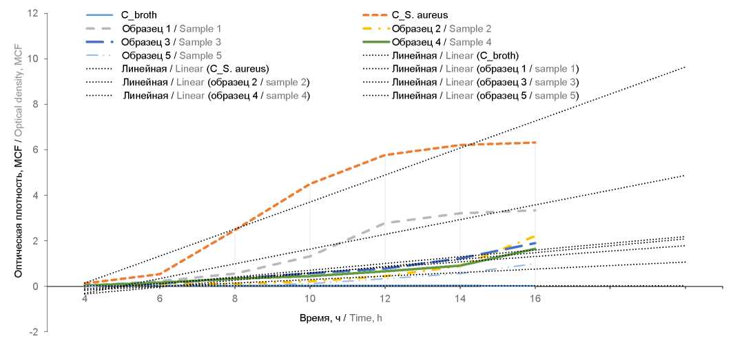 По результатам культивирования референтного штамма S. aureus ATCC 25993 в контрольных пробах (рис. 1) выявлено, что адаптивная фаза продолжалась до 4-го часа эксперимента. На промежутке 3–4 ч отмечалось небольшое начальное изменение ОП, связанное с периодом первичного роста популяции. Интервал с 4-го по 14-й час (продолжительность 10 ч) — фаза экспоненциального развития, на протяжении которого отмечались следующие периоды развития: период ускоренной генерации (4–6 ч); период логарифмического развития (6–12 ч); период отрицательного ускорения (12–14 ч). В логарифмическом периоде развития преобладала относительно высокая скорость генерации новых популяций, и максимальный показатель ОП в окончании данного отрезка составил 5,77 ± 0,3 McF. В результате снижения скорости деления клеток (период отрицательного ускорения) кривая изменения ОП приближалась к линейному вектору развития, и к 16-му часу культивирования была достигнута М-концентрация (показатель ОП — 6,32 ± 0,3 McF). Стационарная фаза отмечалась продолжительностью на промежутке 16–32 ч. Прироста бактериальных клеток и, следовательно, изменения ОП не отмечалось. Средний показатель ОП — 6,41 ± 0,3 McF. С 32-го часа эксперимента отмечается фаза гибели микробной популяции, по тенденции логарифмического спада.