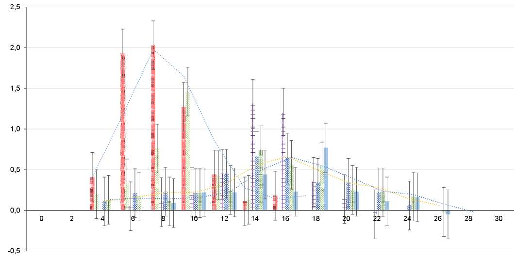 При культивировании бактериальной популяции с добавлением образца 5 отмечалась задержка наступления экспоненциальной фазы развития за счёт удлинения адаптивной фазы до 8 ч. На промежутке 8–14 ч отмечался период ускоренного развития клеток. Истинное логарифмическое развитие популяции имело двуступенчатую тенденцию увеличения биомассы (диауксийный тип развития). Лог-период_1 — 14–16 ч, лог-период_2 — 18–20 ч. На промежутке 16–18 ч отмечалось резкое падение скорости генерации новых популяций. Максимальный показатель ОП в завершение второго периода логарифмического развития — 2,02 ± 0,3 McF (20 ч). Период отрицательного ускорения с последующим добором биомассы культуры был самым продолжительным из всех образцов (7 ч). Переход в стационарное равновесие отмечен на промежутке 25–27 ч с показателем ОП при достижении М-концентрации 2,54 ± 0,3 McF. Средний показатель ОП в стационарной фазе — 2,49 ± 0,3 McF, что на 61% ниже, чем в контрольном образце.