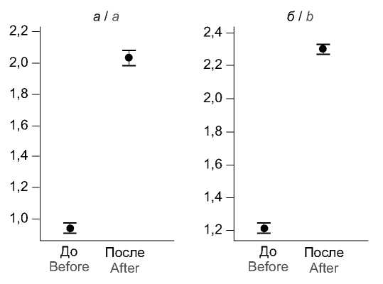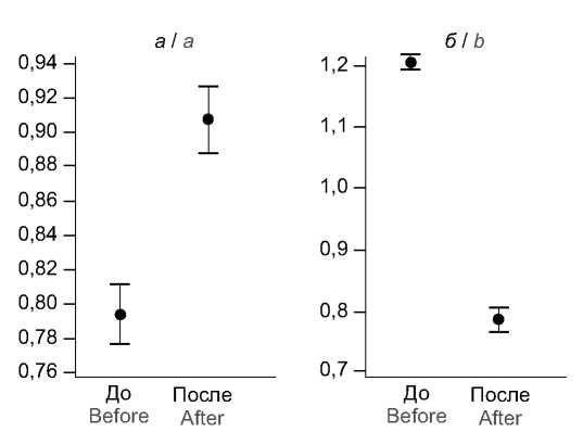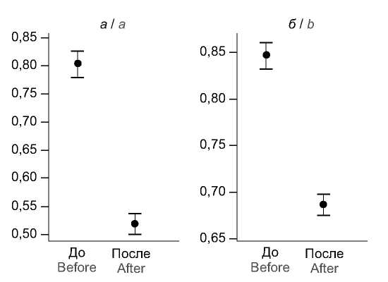 Рис. 3. Ei факультативно-анаэробной (а) и протективной (б) микрофлоры влагалища до и после краткосрочной СИ в группе, находящейся в зоне риска развития бактериального вагиноза.