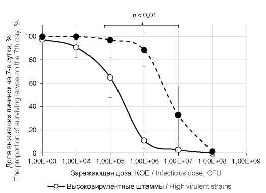 Статистическую обработку экспериментальных данных проводили с помощью пакета «Microsoft Office 2010» и программы «SPSS Statistica 17.0» («IBM»). Проверку распределения на нормальность осуществляли с помощью критерия Колмогорова–Смирнова, нормальным считалось распределение при двусторонней асимптоматической значимости более 0,05. Различие сформированных групп вирулентности подтверждали методом двухвыборочного t-критерия Стьюдента для независимых выборок. Различия считали значимыми при величине коэффициента достоверности p < 0,01.