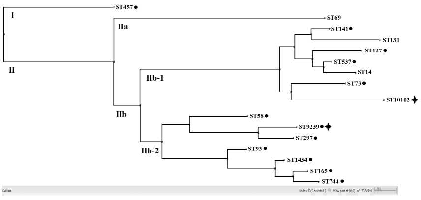 Филогенетический анализ штаммов E. coli проводили с использованием ресурсов NCBI «Blastn» и «Blast Tree View»6 на основании сравнения искусственно собранных последовательностей аллельных профилей генов МЛСТ.