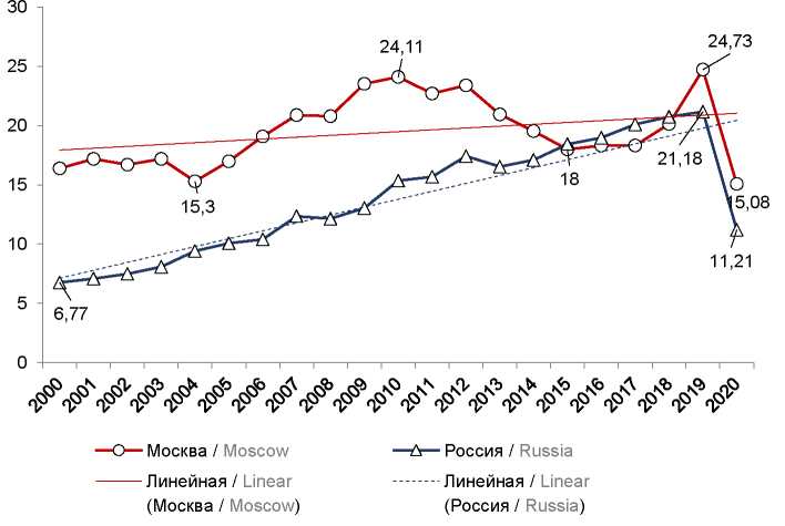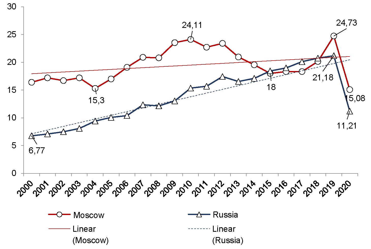 Fig. 1. IM incidence among the population in Moscow and Russia during 2000-2020 (per 100,000 population).