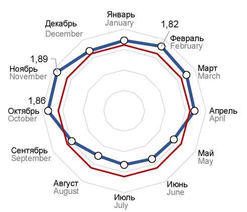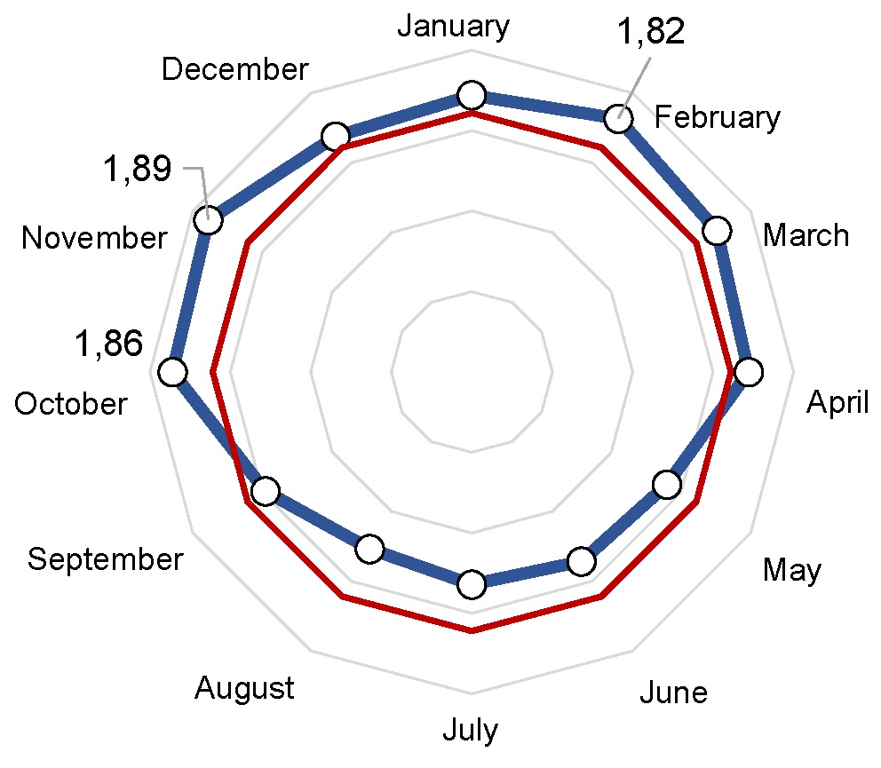 Fig. 2. Intra-annual dynamics of IM incidence in Moscow: multiannual average rates during 2014-2020 (per 100,000 population).