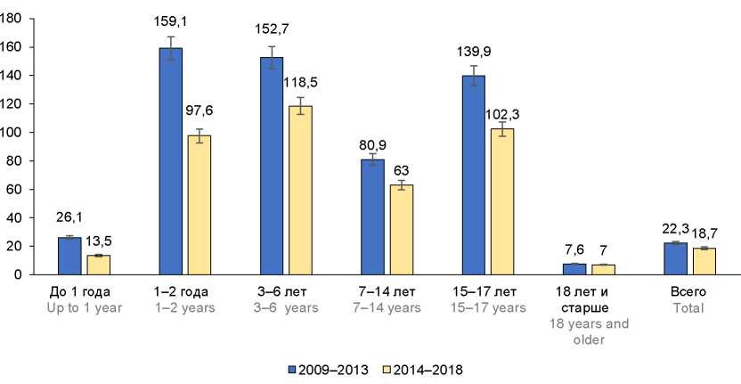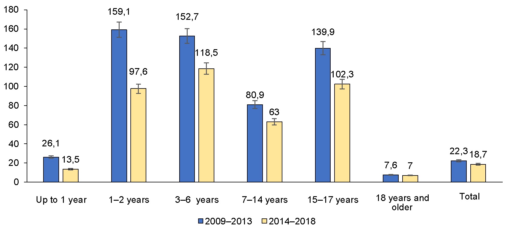 At the same time, changes were observed in the age structure of patients. Compared to 2009–2013, the years showing lower incidence rates (2014–2018) demonstrated a statistically significant decrease in the proportion of cases aged 1–2 years - from 12.4 (95% CI 11.9–12.95) to 11.0% (95% CI 10.5–11.6) and those aged 15–17 years – from 14.4 (95% CI 13.8–15.0) to 12.4 (95% CI 11.8–13.0) and a statistically significant increase in the proportion of cases among people aged 18 years and older – from 28.6% (95% CI 27.8–29.4) to 31.1% (95% CI 30.3–31.9).