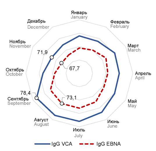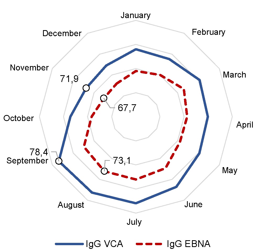 - intra-annual dynamics of IM incidence is characterized by a seasonal upswing during the cold period of the year, with the highest rates in October, November or February, and a marked decrease in the VCA IgG and EBNA IgG seroprevalence (significant, strong inverse correlation: r = –0.8 and r = –0.77, respectively);