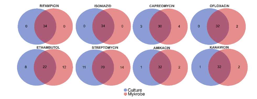 Venn diagram representing the agreement between resistant phenotypes identified by phenotypic cultural method and Mykrobe software prediction tool for 8 tuberculostatics.