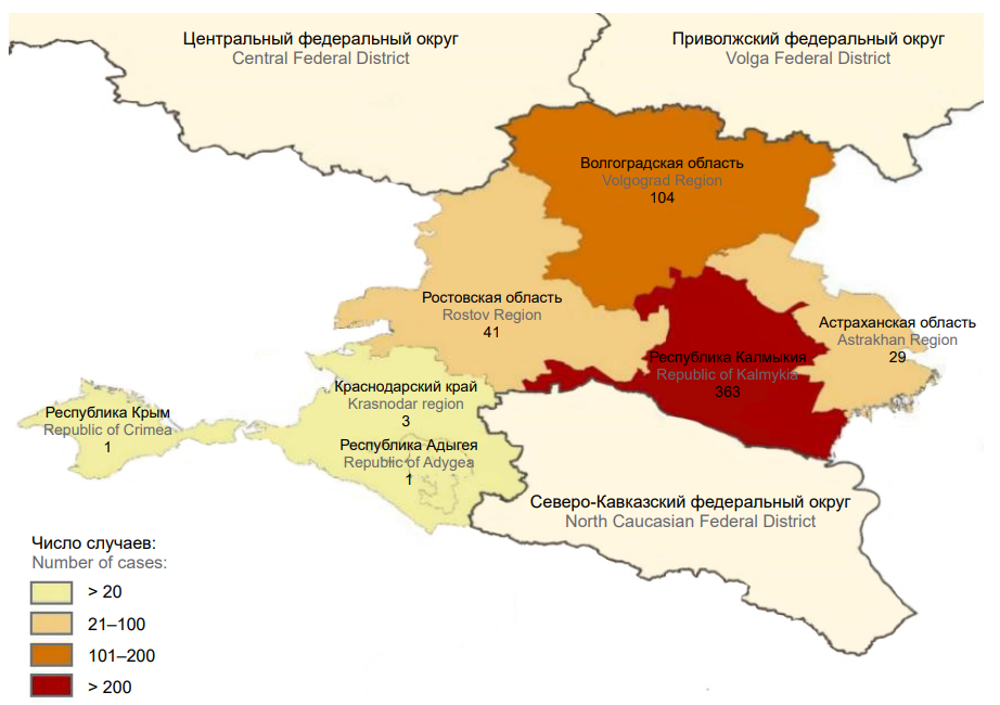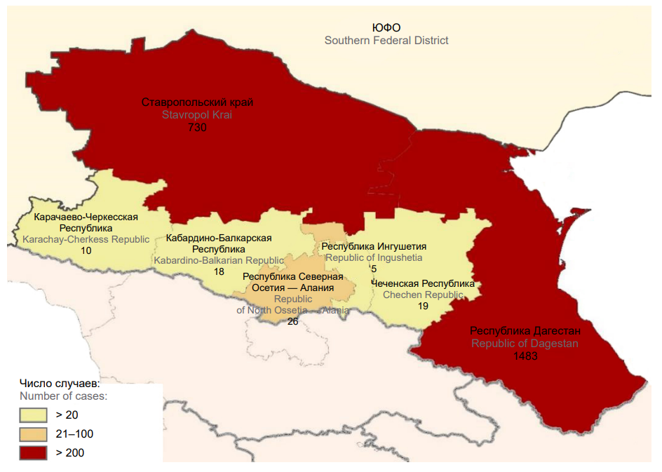 Эпидемиологическая обстановка по бруцеллёзу на территориях юга европейской части России (преимущественно административные территории СКФО и ЮФО) в последнее десятилетие оставалась достаточно напряжённой, вместе с тем отмечался неустойчивый тренд к уменьшению числа случаев заболевания бруцеллёзом. В 2011–2020 гг. в этих федеральных округах было зарегистрировано 79,7% случаев (2794 случая) от общего количества впервые выявленного бруцеллёза в России. Наибольшее количество случаев было установлено на территории СКФО (2291 случай; 65,3%), где бруцеллёз среди людей в основном регистрировали в РД (1483 случая; 5,03 на 100 тыс. населения) и СК (730 случаев; 2,63 на 100 тыс. населения; рис. 1).