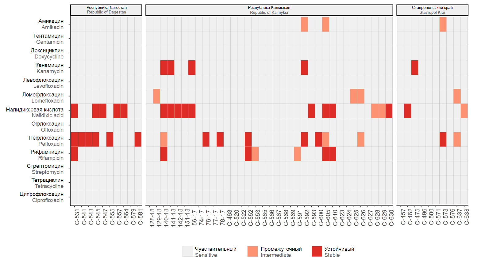 В результате исследований была определена чувствительность/устойчивость штаммов бруцелл в отношении 13 АБП (рис. 3). Из числа исследованных штаммов 13% показали резистентность к 2 и более антибиотикам. Статистически значимой связи устойчивости бруцелл к отдельному препарату с местом выделения культуры обнаружено не было (р > 0,05, точный тест Фишера). Кроме того, статистически значимой связи MLVA-генотипа с профилем антибиотикоустойчивости установить не удалось.