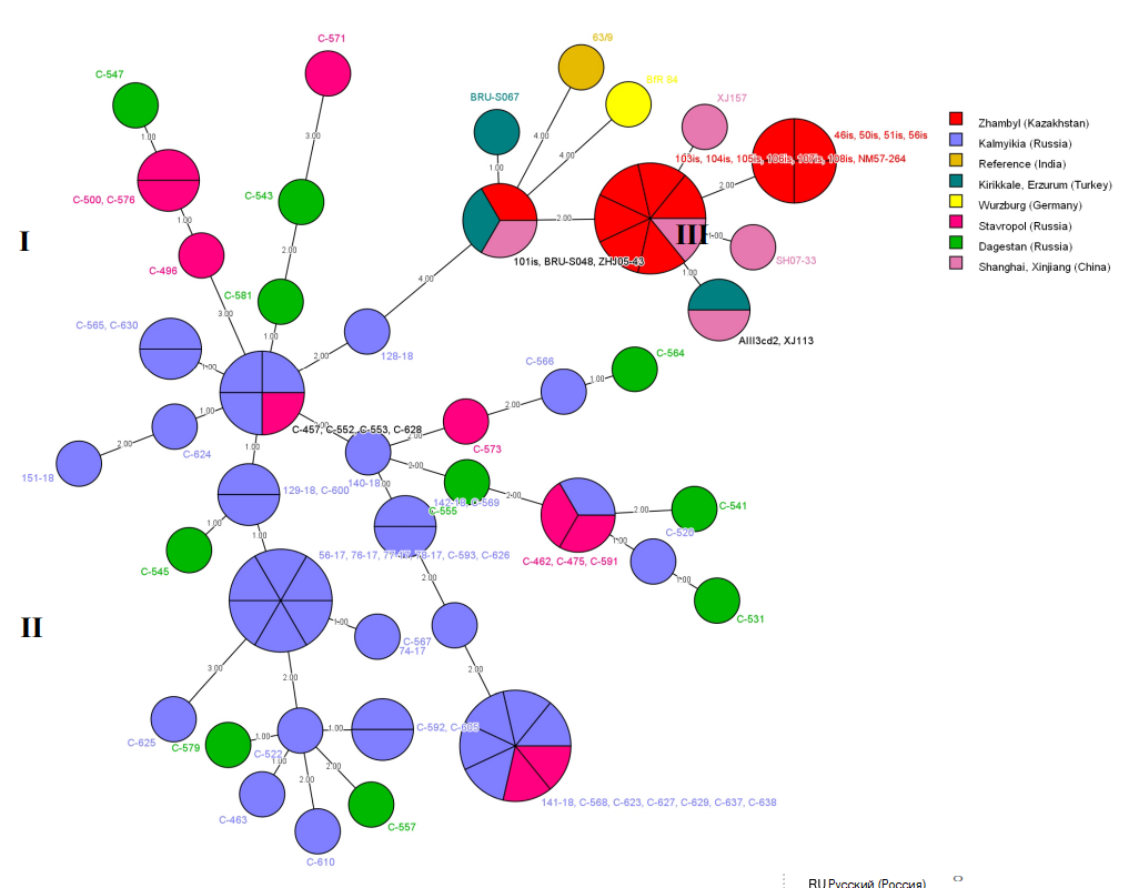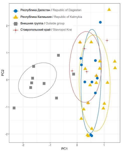 Отдельный кластерный комплекс III образован исключительно штаммами группы сравнения, выделенными от людей в Турции, и культурами, выделенными от овец в Казахстане, Турции и Китае, в 2002, 2005, 2008 и 2013 гг. Наиболее генетически близкими к изученным штаммам оказались изоляты из Турции, что связано с географическим положением территории, через которую пролегали торговые пути из Восточной Азии в Европу. Территория современной Турции часто была промежуточным этапом на пути следования торговых караванов, в том числе с животными и животноводческой продукцией. Вместе с тем известно, что в VI–VII вв. через Северный Прикаспий по территории Северного Кавказа к Черноморскому (Понтийскому) побережью были проложены новые торговые маршруты Великого Шёлкового пути из Китая и Средней Азии. Использование метода главных компонент, основное преимущество которого заключается в уменьшении количества характеристик объекта наблюдения при минимальной потере информации, в качестве метода классификации штаммов по MLVA-генотипу позволило добиться снижения размерности данных путём создания новых переменных (главных компонент) из линейной комбинации исходных характеристик. При визуализации первых двух главных компонент на плоскости штаммы из РД, РК и СК образуют PCA-кластер, обособленный от штаммов внешней группы. Высокая степень пересечения границ PCA-кластеров из юга России, по всей видимости, связана с отсутствием специфичных для региона вариантов VNTR-локусов и значительным сходством MLVA-генотипов (рис. 5).