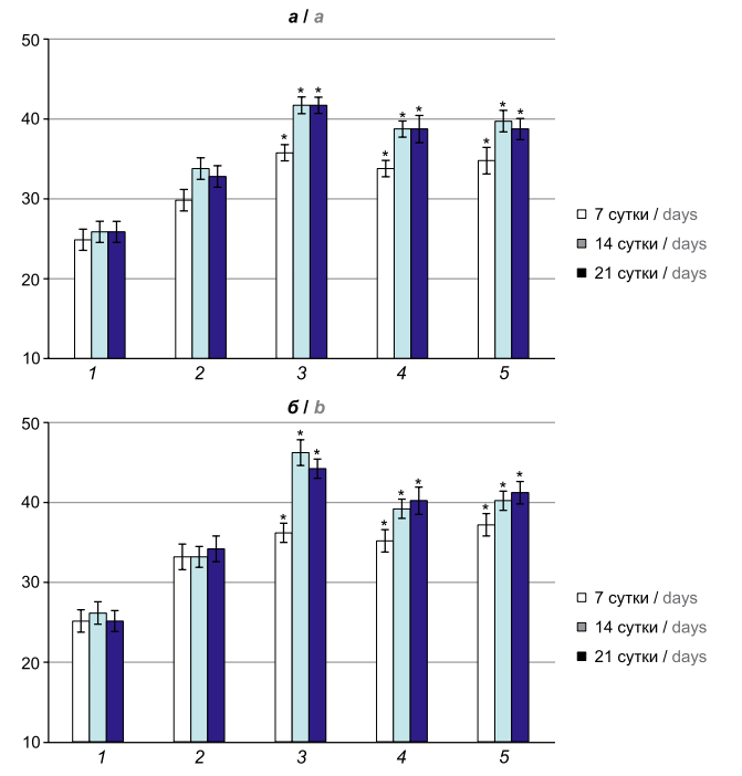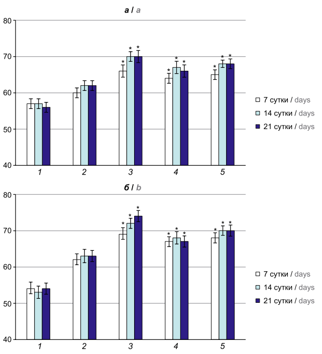 Рис. 1. Влияние АБ, ГМД и НД на количество CD3+-Лф (%) в селезёнке (а) и ПБ (б) вакцинированных белых мышей. 1 — контроль; 2 — вакцина; 3 — вакцина + АБ; 4 — вакцина + ГМД; 5 — вакцина + НД. *р < 0,05 по сравнению с вакцинированными мышами (t-критерий Стьюдента).