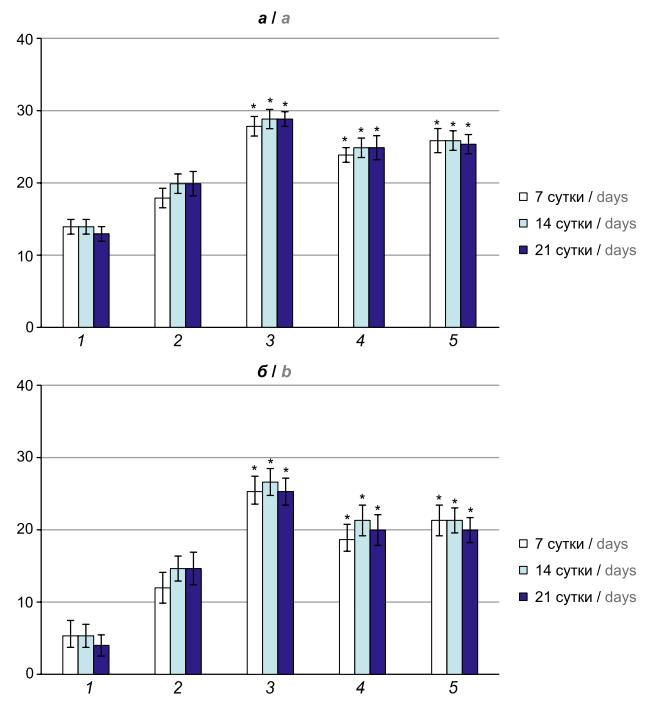Fig. 1. Effect of azoximer bromide, glucosaminylmuramyl dipeptide, and sodium deoxyribonucleate on the number of CD3+-lymphocytes in the spleen (а) and in the Peyer plaques (b) of vaccinated white mice. 1 — control; 2 — vaccine; 3 — vaccine + azoximer bromide; 4 — vaccine + glucosaminylmuramyl dipeptide; 5 — vaccine + sodium deoxyribonucleate. *p < 0.05 compared to vaccinated mice (Student's t-test).