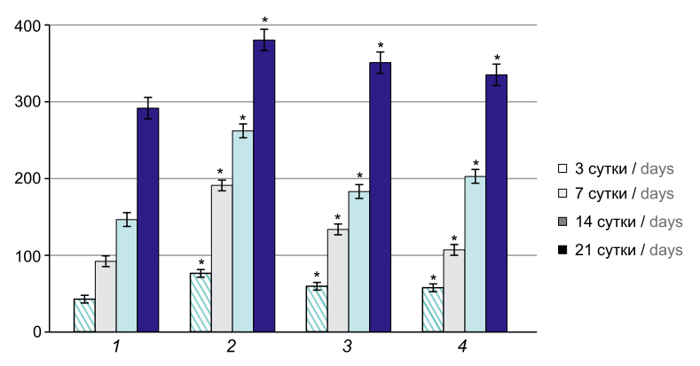 Статистический анализ материалов осуществляли с помощью программ «Мicrosoft Ехсеl 2010» и «StatSoft». Определяли значения доверительных интервалов (L) среднеарифметического (М) для уровня достоверности (р) 95%. Достоверность различий определяли по t-критерию Стьюдента. Уровень р < 0,05 расценивали как значимый.