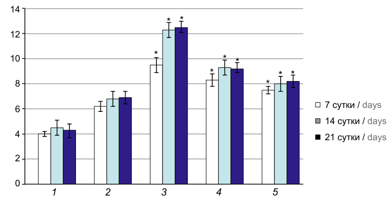 При оценке антителообразования в тонком кишечнике белых вакцинированных мышей установлено, что вакцинация уже на 7-е сутки стимулирует у них продукцию sIgA (6,2 ± 0,4) (рис. 5) по сравнению с интактными животными (4,0 ± 0,5). У иммунизированных мышей, получавших иммуномодуляторы, синтез sIgA идёт более интенсивно с начала (9,50 ± 0,18; 8,30 ± 0,11 и 7,50 ± 0,15) и до окончания наблюдения (12,5 ± 0,6; 9,2 ± 0,3 и 8,2 ± 0,5) по сравнению с группой вакцинированных животных (6,2 ± 0,4 и 6,9 ± 0,8), что свидетельствует о положительном влиянии иммуномодуляции на этот процесс. Наибольшее количество sIgA зарегистрировано у мышей, получавших АБ.