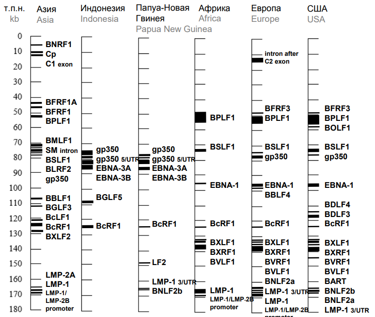 Кроме того, в контексте всего генома ВЭБ (ВЭБ-1) были идентифицированы четыре информативных кодирующих региона, которые имели значение для разделения азиатских и неазиатских клад [7]. В свою очередь, в работе R. Bridges и соавт. c использованием метода главных компонент были выявлены основные наборы SNP относительно эталонного генома ВЭБ, характерные для определённой географической субпопуляции вируса [56], которые схематично представлены на рисунке.