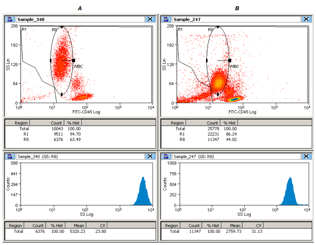 Рис. 1. Интенсивная дегрануляция нейтрофилов и активация лейкоцитолиза в крови больного среднетяжёлой формой COVID-19 (В) в сравнении с результатом анализа лейкоцитов крови здорового донора (А). На опытной и контрольной цитограммах (сверху) гранулоциты крови (нейтрофилы) локализуются в регионе R8, отделяясь по интенсивности бокового светорассеяния (степени своей гранулярности — SS), от лимфоцитов и моноцитов. Под каждой цитограммой представлено частотное распределение отдельных клеток в гейте гранулоцитов (в регионе R8) по степени гранулярности в логарифмическом режиме измерения для количественной оценки интенсивности дегрануляции нейтрофилов в опытном образце (в данном случае 100% × (5320 – 2759)/5320 = 48%). Вне региона R1 на цитограммах учитываются сигналы от клеточного дебриса (лизированных лейкоцитов), доля которых в крови больного (Total – R1 = 100% – 86,24% = 13,76%) существенно выше, чем в контроле (100% – 94,7% = 5,3%).