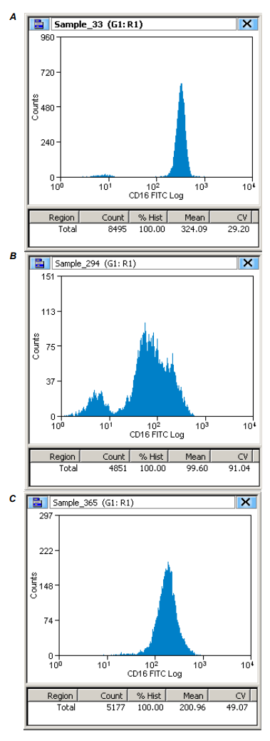 Рис. 2. Экспрессия FcᵧRIIIb (СD16) нейтрофилами крови здорового донора ( А), больного тяжёлой формой COVID-19 ( B) и реконвалесцента ( С). Различия в степени неоднородности клеточных популяций по данному пара - метру. На каждой гистограмме результат распределения клеток по ин - тенсивности иммунофлюоресценции получен в условиях гейти - рования по области R1 (G1:R1), в которой популяция гранулоци - тов крови отделялась от моноцитов и гранулоцитов по параме - трам прямого и бокового светорассеяния [14].