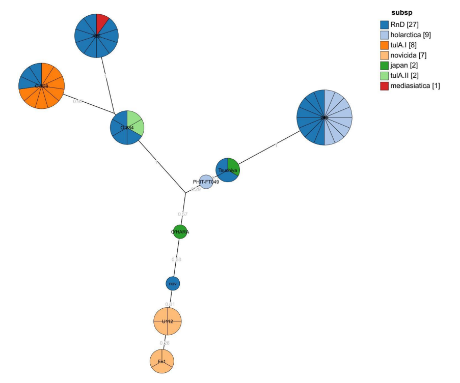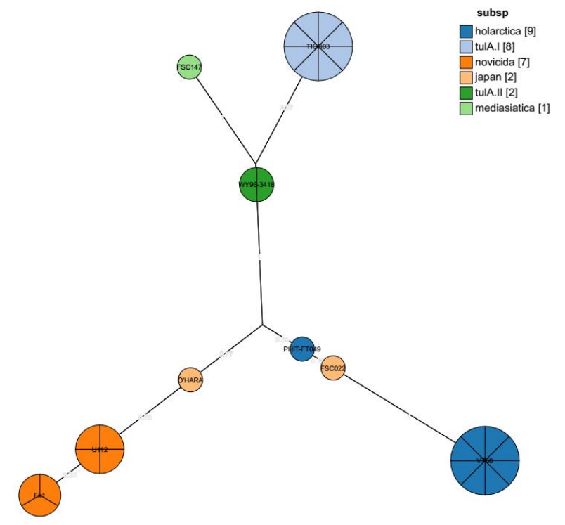 Отмечено соответствующее разделение подвидов tularensis, holarctica, mediasiatica и novicida по разным кластерам, причём подвид tularensis чётко разделён на подгруппы A.I и A.II. Штаммы подвида novicida образуют кластер, разделённый на 2 группы, 3 штамма holarctica bv japonica представлены 3 индивидуальными генотипами, 2 из которых принадлежат генетической линии holarctica. Точную принадлежность штамма O’HARA трудно определить из-за отсутствия данных по одному из локусов в базе данных GenBank.