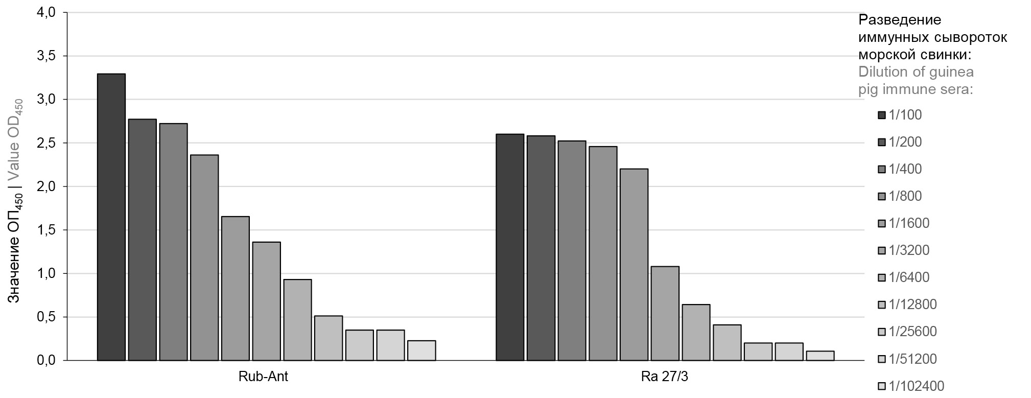 Рис. 3. Значения оптической плотности при длине волны 450 нм (ОП450) специфических сывороток морских свинок на 60-е сутки после иммунизации штаммами vRub-Ant и Wistar RA 27/3 RV.