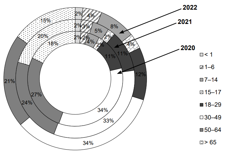 The proportion of children aged 0–17 years increased from 10% in 2020 to 18% of the total number of cases in 2022 (Fig. 10).