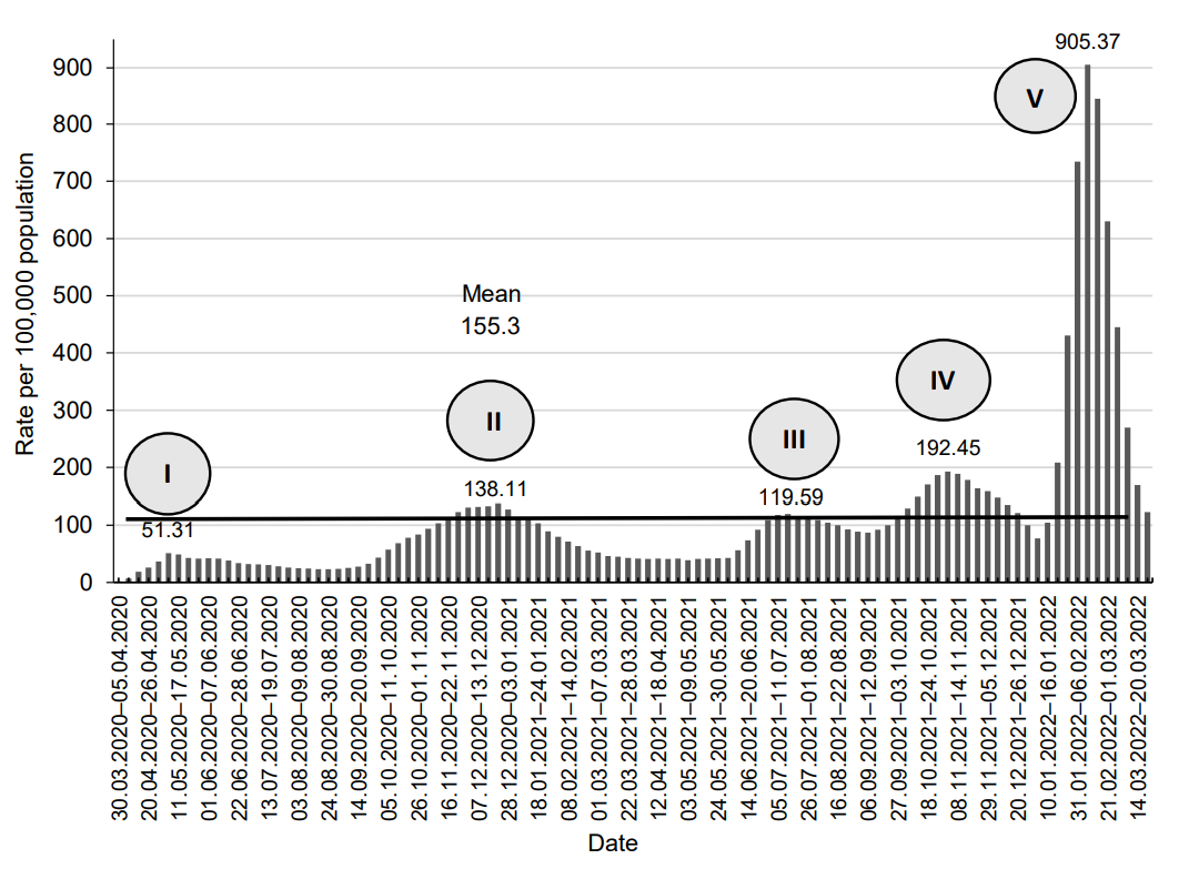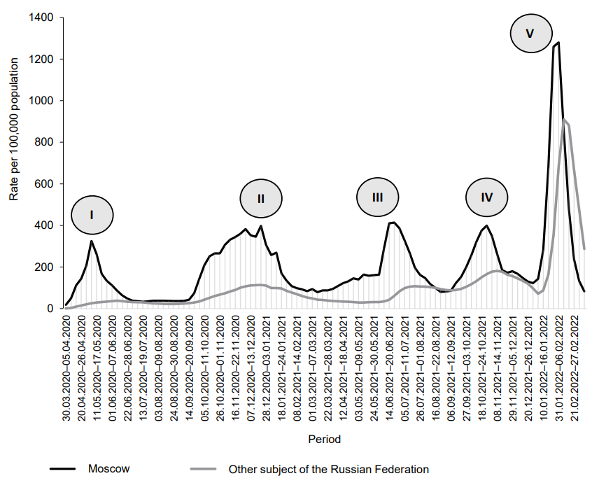 In Russia, the first cases of COVID-19 were reported in areas bordering China 31/1/2020; the first case of imported infection in the European part of the country was recorded on 2/3/2020. From 30/3/2020, the infection started spreading swiftly in megacities and megaregions, and, later, on 16/4/2020, COVID-19 cases were reported in all regions of Russia. During the entire period of monitoring (30/3/2020–24/4/2022) in Russia, a total of 18,137,137 cases of infection were reported. The average COVID-19 incidence rate in Russia during 2021–2022 was 155.3 per 100,000 population. The dynamic assessment of the COVID-19 epidemic situation and its trends in Russia during 2020–2022 showed that there were 5 surges in the incidence. The highest number of cases was recorded during the 5th surge (10/1/2021–27/2/2022), being 905.37 per 100,000 population (Fig. 1).