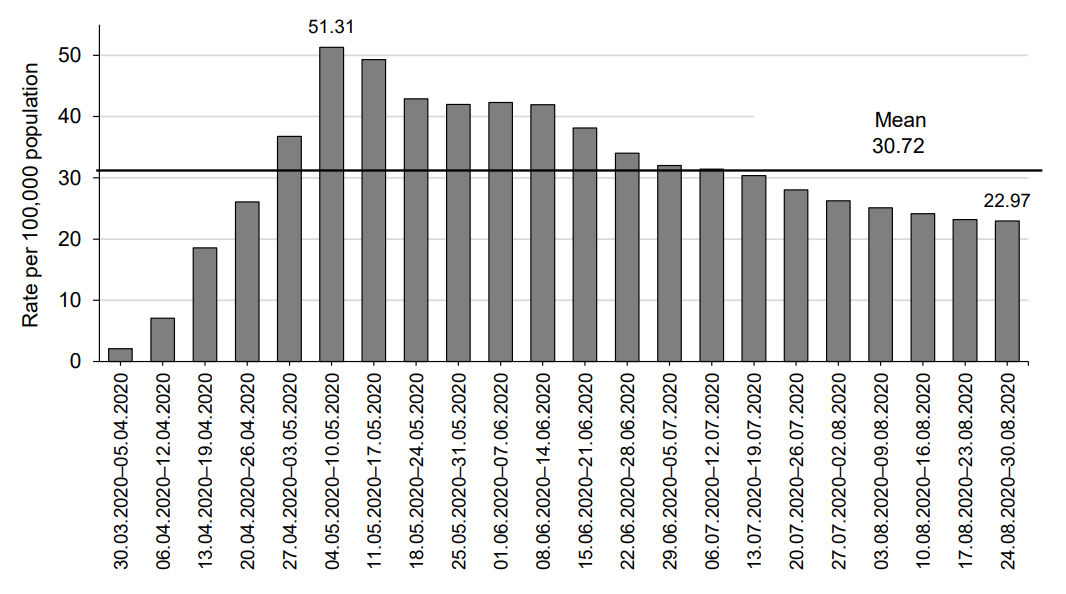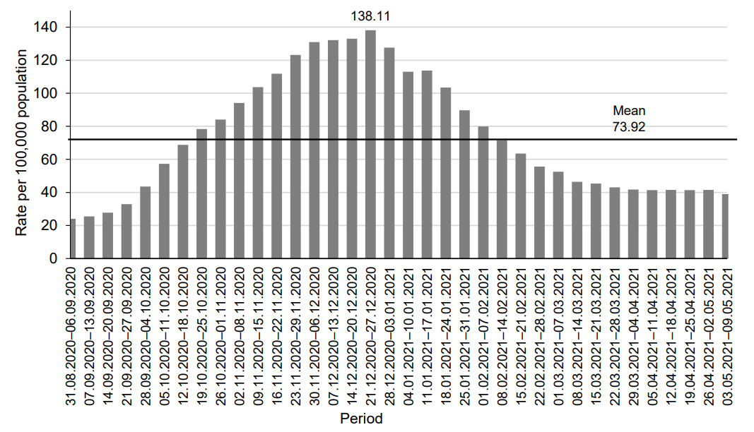 During that period, the rate of increase was characterized by high numbers and ranged from 1.1% to 31.5% weekly (from 59,983 to 174,800 cases). The peak level of 25,766 new cases of infection was recorded during 12/7/2021–18/7/2021, with 119.59 per 100,000 population. Later, the number of newly reported cases went down, having decreased by 7.6% by 31/7/2021 and by 30.9% by 31/8/2021 compared to the highest level (Fig. 5).