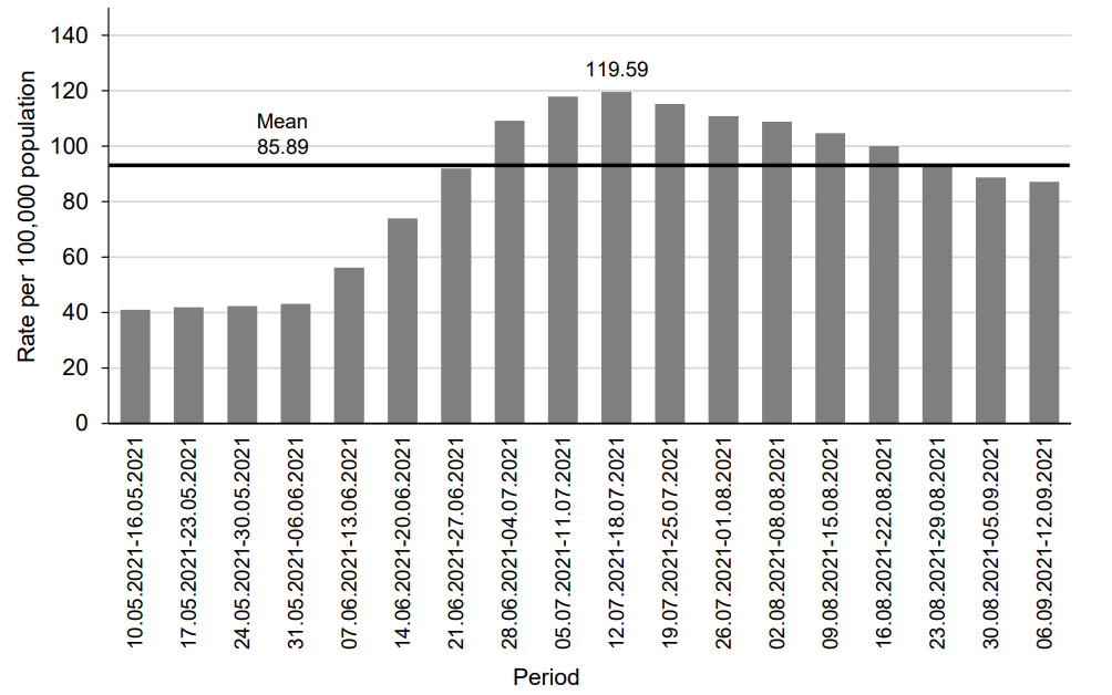 Fig. 5. Dynamics of COVID-19 incidence in the Russian Federation during the third period from May 10, 2021 to September 12, 2021.
