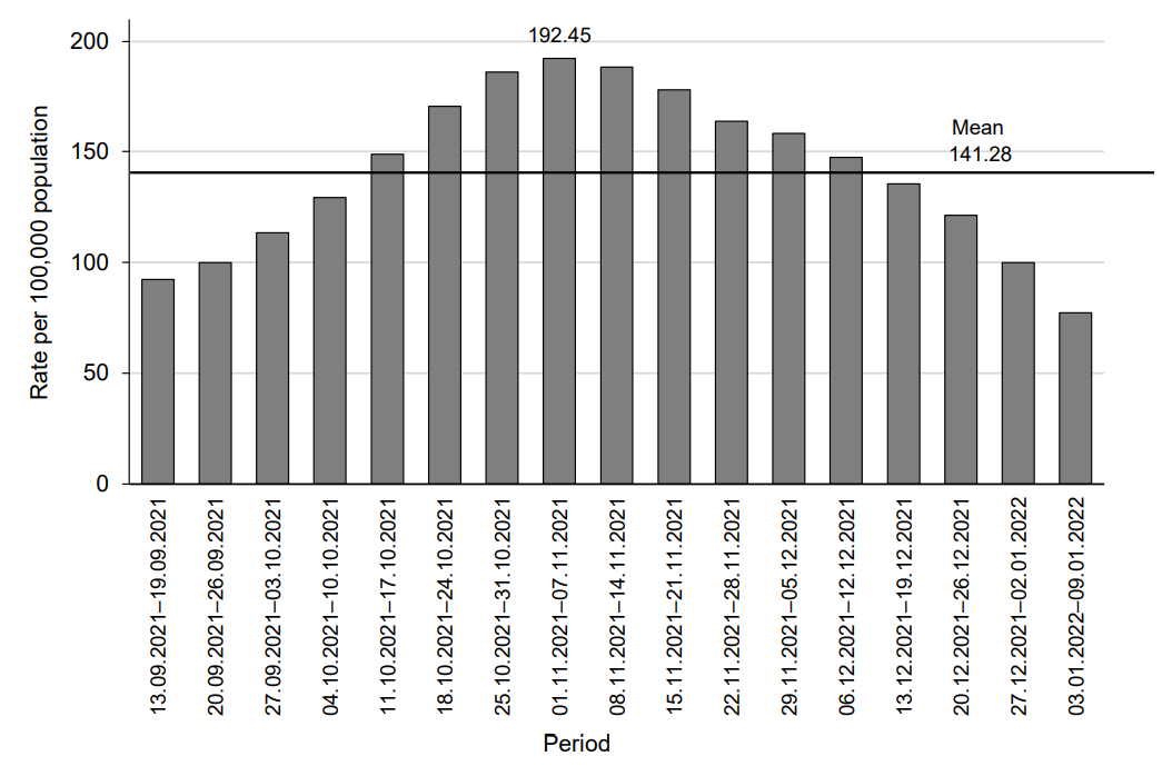 Fig. 6. Dynamics of COVID-19 incidence in the Russian Federation during the fourth period from September 13, 2021 to January 9, 2022.